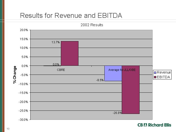 | In 2002 the commercial real estate service sector had an extremely slow start. Transaction velocity began to pick up in the second quarter and continued to improve throughout 2002. Fourth quarter 2002 revenue was up 12% over the previous years fourth quarter, leaving us to achieve full year revenue of $1.17 billion, which was almost exactly the same as the prior year. EBITDA was $130.7 million, approximately 14% higher than 2001. EBITDA margin improved to 11.2% compared to 9.8% in the prior year. These improvements were accomplished through gains in market share despite a challenging leasing market and through our cost containment efforts. |