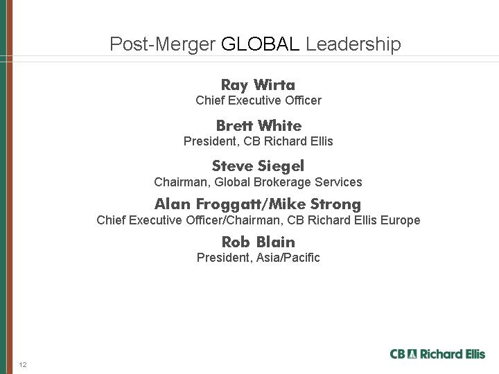 We always believed that CB Richard Ellis would be an important platform in a consolidating industry, said Richard Blum, chairman, Blum Capital Partners, the companys controlling shareholder. This management team continues to deliver strong performance which we know will be further enhanced by the combined enterprise. Blum Capital is pleased to provide the equity capital for the next stage of growth for CB Richard Ellis.