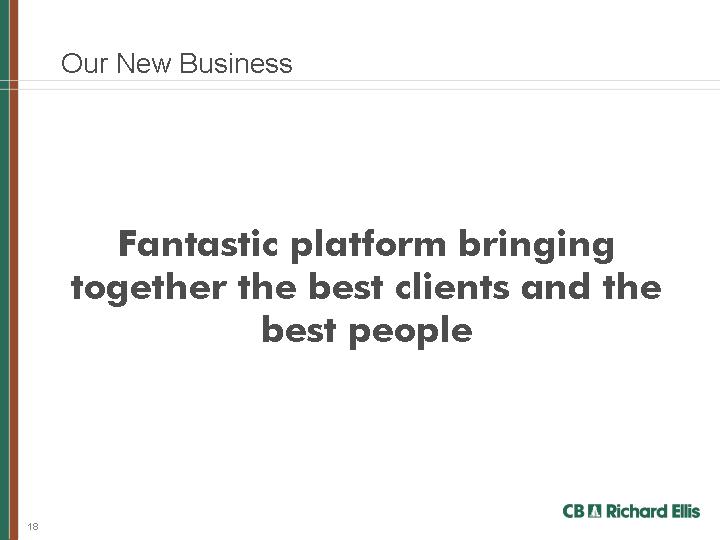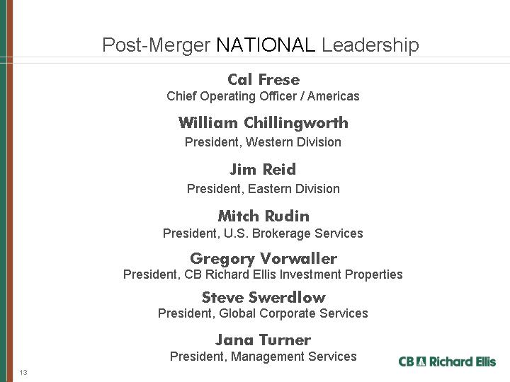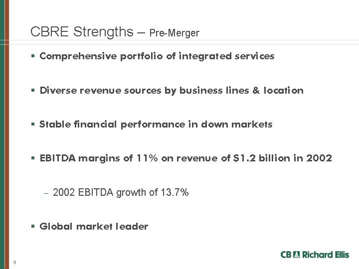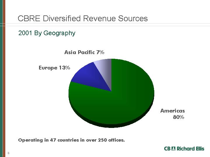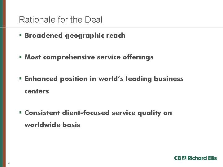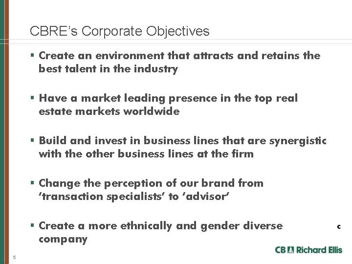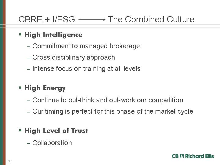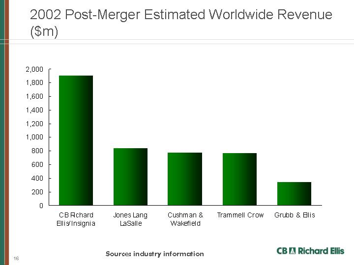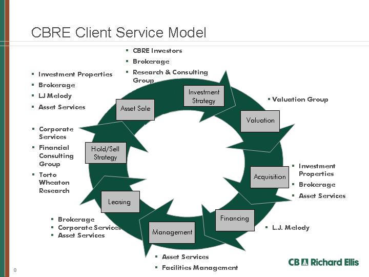 | Acquiring Insignia bolsters our scale, business line, and regional diversity. It strengthens our leadership position in the commercial real estate service industry worldwide, and will increase our annual revenues to in excess of $1.8 billion per year. Strategically the acquisition unites the powerful CB Richard Ellis brand globally and creates a company with nationwide U.S. presence, significant European operations, and market leadership positions in major business centers, including New York, Los Angeles, Chicago, London, Paris, and Hong Kong. |