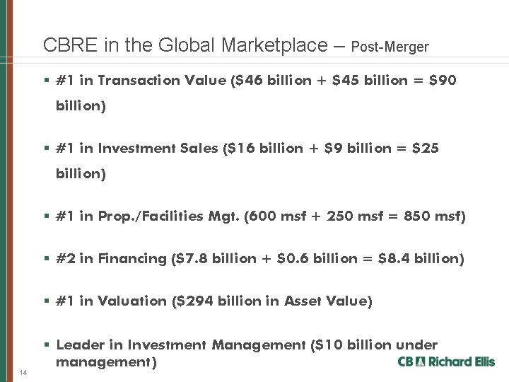 | The combined company is expected to generate over $90 billion of annual sales and leasing transactions, rank as the worlds largest commercial property manager, manage more than $13 billion in assets, and offer the industrys largest proprietary market research. All in all were quite excited about the prospects. |