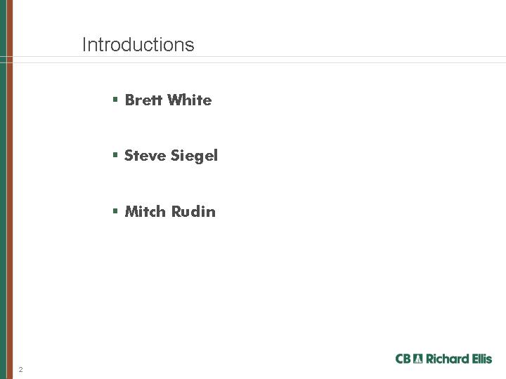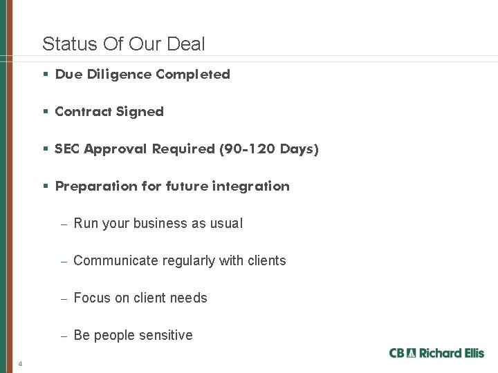 | Before we get started I want to mention that we may make a number of forward-looking statements during the course of this call. These statements should be considered as estimates only, and actual results may ultimately differ from these estimates. CB Richard Ellis undertakes no obligation to update or publicly revise any of the forward-looking statements that you may hear today. Please refer to the companys annual report on Form 10-K and our quarterly reports on Form 10-Q for a full discussion of the risks and other factors that may impact any estimates that you may hear today. |