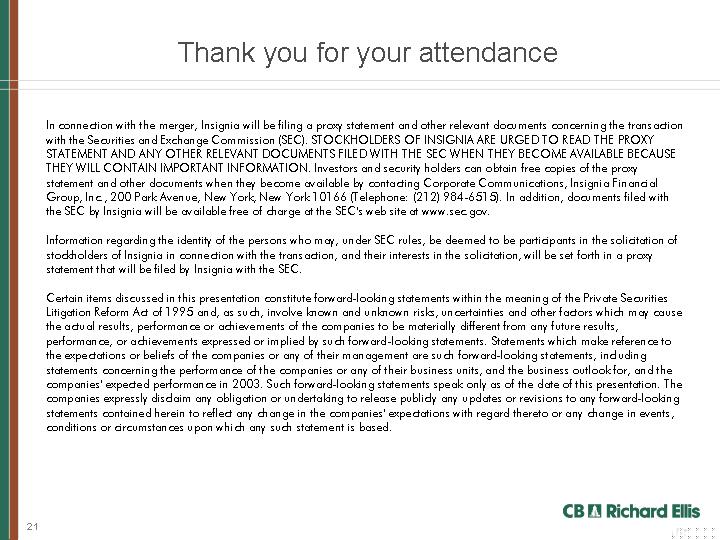 In connection with the merger, Insignia will be filing a proxy statement and other relevant documents concerning the transaction with the Securities and Exchange Commission (SEC). STOCKHOLDERS OF INSIGNIA ARE URGED TO READ THE PROXY STATEMENT AND ANY OTHER RELEVANT DOCUMENTS FILED WITH THE SEC WHEN THEY BECOME AVAILABLE BECAUSE THEY WILL CONTAIN IMPORTANT INFORMATION. Investors and security holders can obtain free copies of the proxy statement and other documents when they become available by contacting Corporate Communications, Insignia Financial Group, Inc., 200 Park Avenue, New York, New York 10166 (Telephone: (212) 984-6515). In addition, documents filed with the SEC by Insignia will be available free of charge at the SECs web site at www.sec.gov.
