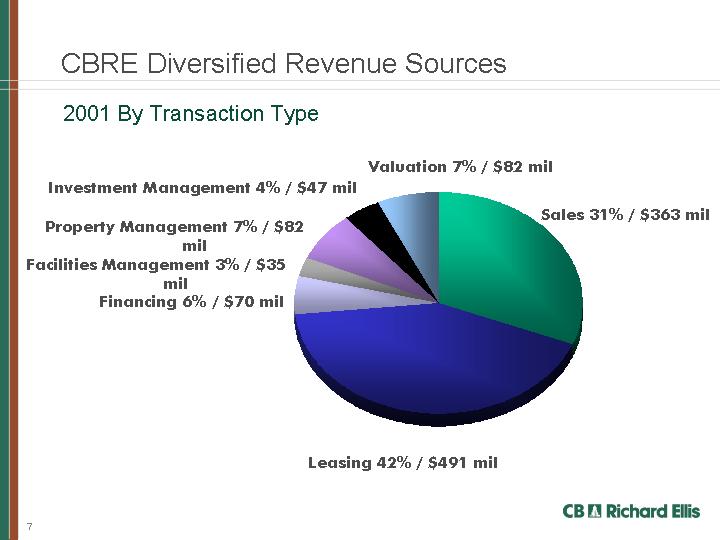 Headquartered in Los Angeles, CB Richard Ellis is one of the worlds leading real estate services companies. With approximately 10,000 employees, the Company serves real estate owners, investors and occupiers throughout approximately 250 owned and affiliated offices in 47 countries. The Companys core services portfolio includes property sales, leasing and management, corporate services, facilities and project management, mortgage banking, investment management, capital markets, appraisal and valuation, research, and consulting. The Company reported net revenues of $1.17 billion in 2001. For more information about CB Richard Ellis, visit the Companys Web site at www.cbre.com