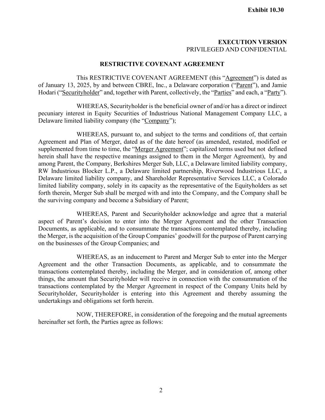 2 EXECUTION VERSION PRIVILEGED AND CONFIDENTIAL RESTRICTIVE COVENANT AGREEMENT This RESTRICTIVE COVENANT AGREEMENT (this “Agreement”) is dated as of January 13, 2025, by and between CBRE, Inc., a Delaware corporation (“Parent”), and Jamie Hodari (“Securityholder” and, together with Parent, collectively, the “Parties” and each, a “Party”). WHEREAS, Securityholder is the beneficial owner of and/or has a direct or indirect pecuniary interest in Equity Securities of Industrious National Management Company LLC, a Delaware limited liability company (the “Company”); WHEREAS, pursuant to, and subject to the terms and conditions of, that certain Agreement and Plan of Merger, dated as of the date hereof (as amended, restated, modified or supplemented from time to time, the “Merger Agreement”; capitalized terms used but not defined herein shall have the respective meanings assigned to them in the Merger Agreement), by and among Parent, the Company, Berkshires Merger Sub, LLC, a Delaware limited liability company, RW Industrious Blocker L.P., a Delaware limited partnership, Riverwood Industrious LLC, a Delaware limited liability company, and Shareholder Representative Services LLC, a Colorado limited liability company, solely in its capacity as the representative of the Equityholders as set forth therein, Merger Sub shall be merged with and into the Company, and the Company shall be the surviving company and become a Subsidiary of Parent; WHEREAS, Parent and Securityholder acknowledge and agree that a material aspect of Parent’s decision to enter into the Merger Agreement and the other Transaction Documents, as applicable, and to consummate the transactions contemplated thereby, including the Merger, is the acquisition of the Group Companies’ goodwill for the purpose of Parent carrying on the businesses of the Group Companies; and WHEREAS, as an inducement to Parent and Merger Sub to enter into the Merger Agreement and the other Transaction Documents, as applicable, and to consummate the transactions contemplated thereby, including the Merger, and in consideration of, among other things, the amount that Securityholder will receive in connection with the consummation of the transactions contemplated by the Merger Agreement in respect of the Company Units held by Securityholder, Securityholder is entering into this Agreement and thereby assuming the undertakings and obligations set forth herein. NOW, THEREFORE, in consideration of the foregoing and the mutual agreements hereinafter set forth, the Parties agree as follows: Exhibit 10.30