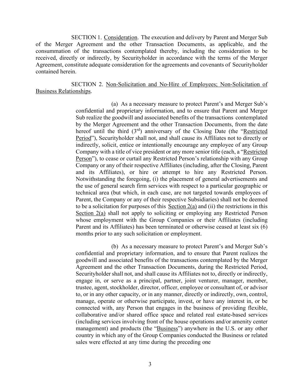 3 SECTION 1. Consideration. The execution and delivery by Parent and Merger Sub of the Merger Agreement and the other Transaction Documents, as applicable, and the consummation of the transactions contemplated thereby, including the consideration to be received, directly or indirectly, by Securityholder in accordance with the terms of the Merger Agreement, constitute adequate consideration for the agreements and covenants of Securityholder contained herein. SECTION 2. Non-Solicitation and No-Hire of Employees; Non-Solicitation of Business Relationships. (a) As a necessary measure to protect Parent’s and Merger Sub’s confidential and proprietary information, and to ensure that Parent and Merger Sub realize the goodwill and associated benefits of the transactions contemplated by the Merger Agreement and the other Transaction Documents, from the date hereof until the third (3rd) anniversary of the Closing Date (the “Restricted Period”), Securityholder shall not, and shall cause its Affiliates not to directly or indirectly, solicit, entice or intentionally encourage any employee of any Group Company with a title of vice president or any more senior title (each, a “Restricted Person”), to cease or curtail any Restricted Person’s relationship with any Group Company or any of their respective Affiliates (including, after the Closing, Parent and its Affiliates), or hire or attempt to hire any Restricted Person. Notwithstanding the foregoing, (i) the placement of general advertisements and the use of general search firm services with respect to a particular geographic or technical area (but which, in each case, are not targeted towards employees of Parent, the Company or any of their respective Subsidiaries) shall not be deemed to be a solicitation for purposes of this Section 2(a) and (ii) the restrictions in this Section 2(a) shall not apply to soliciting or employing any Restricted Person whose employment with the Group Companies or their Affiliates (including Parent and its Affiliates) has been terminated or otherwise ceased at least six (6) months prior to any such solicitation or employment. (b) As a necessary measure to protect Parent’s and Merger Sub’s confidential and proprietary information, and to ensure that Parent realizes the goodwill and associated benefits of the transactions contemplated by the Merger Agreement and the other Transaction Documents, during the Restricted Period, Securityholder shall not, and shall cause its Affiliates not to, directly or indirectly, engage in, or serve as a principal, partner, joint venturer, manager, member, trustee, agent, stockholder, director, officer, employee or consultant of, or advisor to, or in any other capacity, or in any manner, directly or indirectly, own, control, manage, operate or otherwise participate, invest, or have any interest in, or be connected with, any Person that engages in the business of providing flexible, collaborative and/or shared office space and related real estate-based services (including services involving front of the house operations and/or amenity center management) and products (the “Business”) anywhere in the U.S. or any other country in which any of the Group Companies conducted the Business or related sales were effected at any time during the preceding one