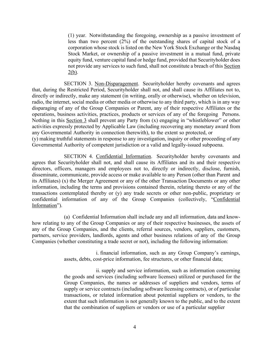 4 (1) year. Notwithstanding the foregoing, ownership as a passive investment of less than two percent (2%) of the outstanding shares of capital stock of a corporation whose stock is listed on the New York Stock Exchange or the Nasdaq Stock Market, or ownership of a passive investment in a mutual fund, private equity fund, venture capital fund or hedge fund, provided that Securityholder does not provide any services to such fund, shall not constitute a breach of this Section 2(b). SECTION 3. Non-Disparagement. Securityholder hereby covenants and agrees that, during the Restricted Period, Securityholder shall not, and shall cause its Affiliates not to, directly or indirectly, make any statement (in writing, orally or otherwise), whether on television, radio, the internet, social media or other media or otherwise to any third party, which is in any way disparaging of any of the Group Companies or Parent, any of their respective Affiliates or the operations, business activities, practices, products or services of any of the foregoing Persons. Nothing in this Section 3 shall prevent any Party from (x) engaging in “whistleblower” or other activities expressly protected by Applicable Law (including recovering any monetary award from any Governmental Authority in connection therewith), to the extent so protected, or (y) making truthful statements in response to any investigation, inquiry or other proceeding of any Governmental Authority of competent jurisdiction or a valid and legally-issued subpoena. SECTION 4. Confidential Information. Securityholder hereby covenants and agrees that Securityholder shall not, and shall cause its Affiliates and its and their respective directors, officers, managers and employees not to, directly or indirectly, disclose, furnish, disseminate, communicate, provide access or make available to any Person (other than Parent and its Affiliates) (x) the Merger Agreement or any of the other Transaction Documents or any other information, including the terms and provisions contained therein, relating thereto or any of the transactions contemplated thereby or (y) any trade secrets or other non-public, proprietary or confidential information of any of the Group Companies (collectively, “Confidential Information”). (a) Confidential Information shall include any and all information, data and know- how relating to any of the Group Companies or any of their respective businesses, the assets of any of the Group Companies, and the clients, referral sources, vendors, suppliers, customers, partners, service providers, landlords, agents and other business relations of any of the Group Companies (whether constituting a trade secret or not), including the following information: i. financial information, such as any Group Company’s earnings, assets, debts, cost-price information, fee structures, or other financial data; ii. supply and service information, such as information concerning the goods and services (including software licenses) utilized or purchased for the Group Companies, the names or addresses of suppliers and vendors, terms of supply or service contracts (including software licensing contracts), or of particular transactions, or related information about potential suppliers or vendors, to the extent that such information is not generally known to the public, and to the extent that the combination of suppliers or vendors or use of a particular supplier