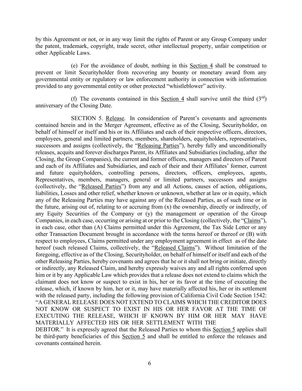 6 by this Agreement or not, or in any way limit the rights of Parent or any Group Company under the patent, trademark, copyright, trade secret, other intellectual property, unfair competition or other Applicable Laws. (e) For the avoidance of doubt, nothing in this Section 4 shall be construed to prevent or limit Securityholder from recovering any bounty or monetary award from any governmental entity or regulatory or law enforcement authority in connection with information provided to any governmental entity or other protected “whistleblower” activity. (f) The covenants contained in this Section 4 shall survive until the third (3rd) anniversary of the Closing Date. SECTION 5. Release. In consideration of Parent’s covenants and agreements contained herein and in the Merger Agreement, effective as of the Closing, Securityholder, on behalf of himself or itself and his or its Affiliates and each of their respective officers, directors, employees, general and limited partners, members, shareholders, equityholders, representatives, successors and assigns (collectively, the “Releasing Parties”), hereby fully and unconditionally releases, acquits and forever discharges Parent, its Affiliates and Subsidiaries (including, after the Closing, the Group Companies), the current and former officers, managers and directors of Parent and each of its Affiliates and Subsidiaries, and each of their and their Affiliates’ former, current and future equityholders, controlling persons, directors, officers, employees, agents, Representatives, members, managers, general or limited partners, successors and assigns (collectively, the “Released Parties”) from any and all Actions, causes of action, obligations, liabilities, Losses and other relief, whether known or unknown, whether at law or in equity, which any of the Releasing Parties may have against any of the Released Parties, as of such time or in the future, arising out of, relating to or accruing from (x) the ownership, directly or indirectly, of any Equity Securities of the Company or (y) the management or operation of the Group Companies, in each case, occurring or arising at or prior to the Closing (collectively, the “Claims”), in each case, other than (A) Claims permitted under this Agreement, the Tax Side Letter or any other Transaction Document brought in accordance with the terms hereof or thereof or (B) with respect to employees, Claims permitted under any employment agreement in effect as of the date hereof (such released Claims, collectively, the “Released Claims”). Without limitation of the foregoing, effective as of the Closing, Securityholder, on behalf of himself or itself and each of the other Releasing Parties, hereby covenants and agrees that he or it shall not bring or initiate, directly or indirectly, any Released Claim, and hereby expressly waives any and all rights conferred upon him or it by any Applicable Law which provides that a release does not extend to claims which the claimant does not know or suspect to exist in his, her or its favor at the time of executing the release, which, if known by him, her or it, may have materially affected his, her or its settlement with the released party, including the following provision of California Civil Code Section 1542: “A GENERAL RELEASE DOES NOT EXTEND TO CLAIMS WHICH THE CREDITOR DOES NOT KNOW OR SUSPECT TO EXIST IN HIS OR HER FAVOR AT THE TIME OF EXECUTING THE RELEASE, WHICH IF KNOWN BY HIM OR HER MAY HAVE MATERIALLY AFFECTED HIS OR HER SETTLEMENT WITH THE DEBTOR.” It is expressly agreed that the Released Parties to whom this Section 5 applies shall be third-party beneficiaries of this Section 5 and shall be entitled to enforce the releases and covenants contained herein.