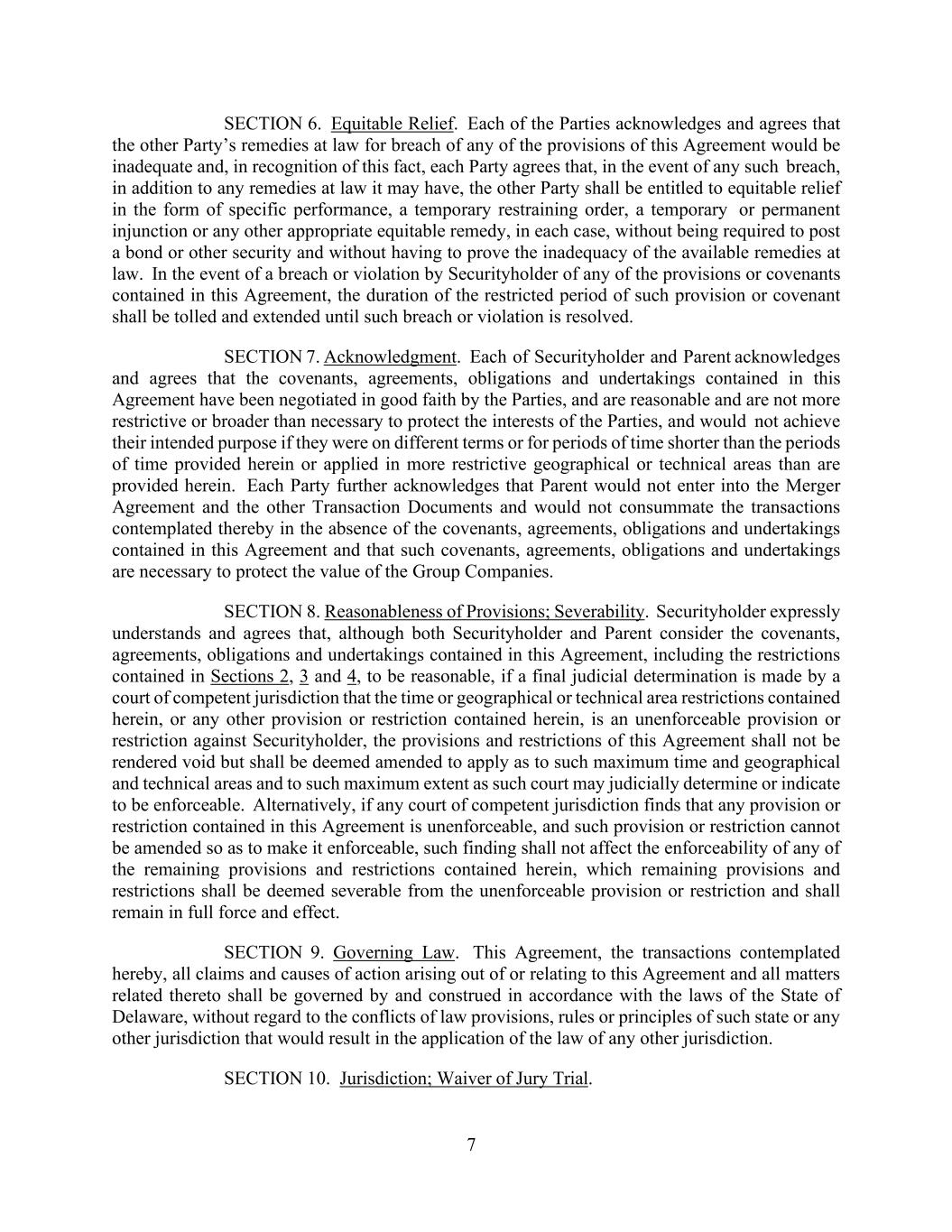7 SECTION 6. Equitable Relief. Each of the Parties acknowledges and agrees that the other Party’s remedies at law for breach of any of the provisions of this Agreement would be inadequate and, in recognition of this fact, each Party agrees that, in the event of any such breach, in addition to any remedies at law it may have, the other Party shall be entitled to equitable relief in the form of specific performance, a temporary restraining order, a temporary or permanent injunction or any other appropriate equitable remedy, in each case, without being required to post a bond or other security and without having to prove the inadequacy of the available remedies at law. In the event of a breach or violation by Securityholder of any of the provisions or covenants contained in this Agreement, the duration of the restricted period of such provision or covenant shall be tolled and extended until such breach or violation is resolved. SECTION 7. Acknowledgment. Each of Securityholder and Parent acknowledges and agrees that the covenants, agreements, obligations and undertakings contained in this Agreement have been negotiated in good faith by the Parties, and are reasonable and are not more restrictive or broader than necessary to protect the interests of the Parties, and would not achieve their intended purpose if they were on different terms or for periods of time shorter than the periods of time provided herein or applied in more restrictive geographical or technical areas than are provided herein. Each Party further acknowledges that Parent would not enter into the Merger Agreement and the other Transaction Documents and would not consummate the transactions contemplated thereby in the absence of the covenants, agreements, obligations and undertakings contained in this Agreement and that such covenants, agreements, obligations and undertakings are necessary to protect the value of the Group Companies. SECTION 8. Reasonableness of Provisions; Severability. Securityholder expressly understands and agrees that, although both Securityholder and Parent consider the covenants, agreements, obligations and undertakings contained in this Agreement, including the restrictions contained in Sections 2, 3 and 4, to be reasonable, if a final judicial determination is made by a court of competent jurisdiction that the time or geographical or technical area restrictions contained herein, or any other provision or restriction contained herein, is an unenforceable provision or restriction against Securityholder, the provisions and restrictions of this Agreement shall not be rendered void but shall be deemed amended to apply as to such maximum time and geographical and technical areas and to such maximum extent as such court may judicially determine or indicate to be enforceable. Alternatively, if any court of competent jurisdiction finds that any provision or restriction contained in this Agreement is unenforceable, and such provision or restriction cannot be amended so as to make it enforceable, such finding shall not affect the enforceability of any of the remaining provisions and restrictions contained herein, which remaining provisions and restrictions shall be deemed severable from the unenforceable provision or restriction and shall remain in full force and effect. SECTION 9. Governing Law. This Agreement, the transactions contemplated hereby, all claims and causes of action arising out of or relating to this Agreement and all matters related thereto shall be governed by and construed in accordance with the laws of the State of Delaware, without regard to the conflicts of law provisions, rules or principles of such state or any other jurisdiction that would result in the application of the law of any other jurisdiction. SECTION 10. Jurisdiction; Waiver of Jury Trial.