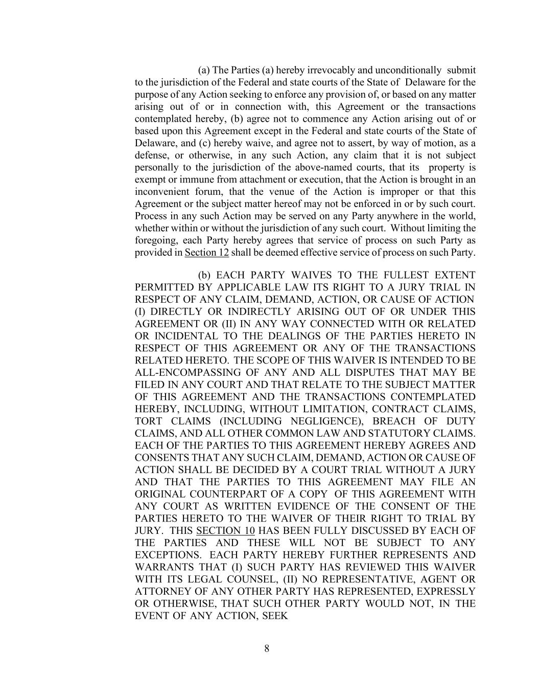 8 (a) The Parties (a) hereby irrevocably and unconditionally submit to the jurisdiction of the Federal and state courts of the State of Delaware for the purpose of any Action seeking to enforce any provision of, or based on any matter arising out of or in connection with, this Agreement or the transactions contemplated hereby, (b) agree not to commence any Action arising out of or based upon this Agreement except in the Federal and state courts of the State of Delaware, and (c) hereby waive, and agree not to assert, by way of motion, as a defense, or otherwise, in any such Action, any claim that it is not subject personally to the jurisdiction of the above-named courts, that its property is exempt or immune from attachment or execution, that the Action is brought in an inconvenient forum, that the venue of the Action is improper or that this Agreement or the subject matter hereof may not be enforced in or by such court. Process in any such Action may be served on any Party anywhere in the world, whether within or without the jurisdiction of any such court. Without limiting the foregoing, each Party hereby agrees that service of process on such Party as provided in Section 12 shall be deemed effective service of process on such Party. (b) EACH PARTY WAIVES TO THE FULLEST EXTENT PERMITTED BY APPLICABLE LAW ITS RIGHT TO A JURY TRIAL IN RESPECT OF ANY CLAIM, DEMAND, ACTION, OR CAUSE OF ACTION (I) DIRECTLY OR INDIRECTLY ARISING OUT OF OR UNDER THIS AGREEMENT OR (II) IN ANY WAY CONNECTED WITH OR RELATED OR INCIDENTAL TO THE DEALINGS OF THE PARTIES HERETO IN RESPECT OF THIS AGREEMENT OR ANY OF THE TRANSACTIONS RELATED HERETO. THE SCOPE OF THIS WAIVER IS INTENDED TO BE ALL-ENCOMPASSING OF ANY AND ALL DISPUTES THAT MAY BE FILED IN ANY COURT AND THAT RELATE TO THE SUBJECT MATTER OF THIS AGREEMENT AND THE TRANSACTIONS CONTEMPLATED HEREBY, INCLUDING, WITHOUT LIMITATION, CONTRACT CLAIMS, TORT CLAIMS (INCLUDING NEGLIGENCE), BREACH OF DUTY CLAIMS, AND ALL OTHER COMMON LAW AND STATUTORY CLAIMS. EACH OF THE PARTIES TO THIS AGREEMENT HEREBY AGREES AND CONSENTS THAT ANY SUCH CLAIM, DEMAND, ACTION OR CAUSE OF ACTION SHALL BE DECIDED BY A COURT TRIAL WITHOUT A JURY AND THAT THE PARTIES TO THIS AGREEMENT MAY FILE AN ORIGINAL COUNTERPART OF A COPY OF THIS AGREEMENT WITH ANY COURT AS WRITTEN EVIDENCE OF THE CONSENT OF THE PARTIES HERETO TO THE WAIVER OF THEIR RIGHT TO TRIAL BY JURY. THIS SECTION 10 HAS BEEN FULLY DISCUSSED BY EACH OF THE PARTIES AND THESE WILL NOT BE SUBJECT TO ANY EXCEPTIONS. EACH PARTY HEREBY FURTHER REPRESENTS AND WARRANTS THAT (I) SUCH PARTY HAS REVIEWED THIS WAIVER WITH ITS LEGAL COUNSEL, (II) NO REPRESENTATIVE, AGENT OR ATTORNEY OF ANY OTHER PARTY HAS REPRESENTED, EXPRESSLY OR OTHERWISE, THAT SUCH OTHER PARTY WOULD NOT, IN THE EVENT OF ANY ACTION, SEEK