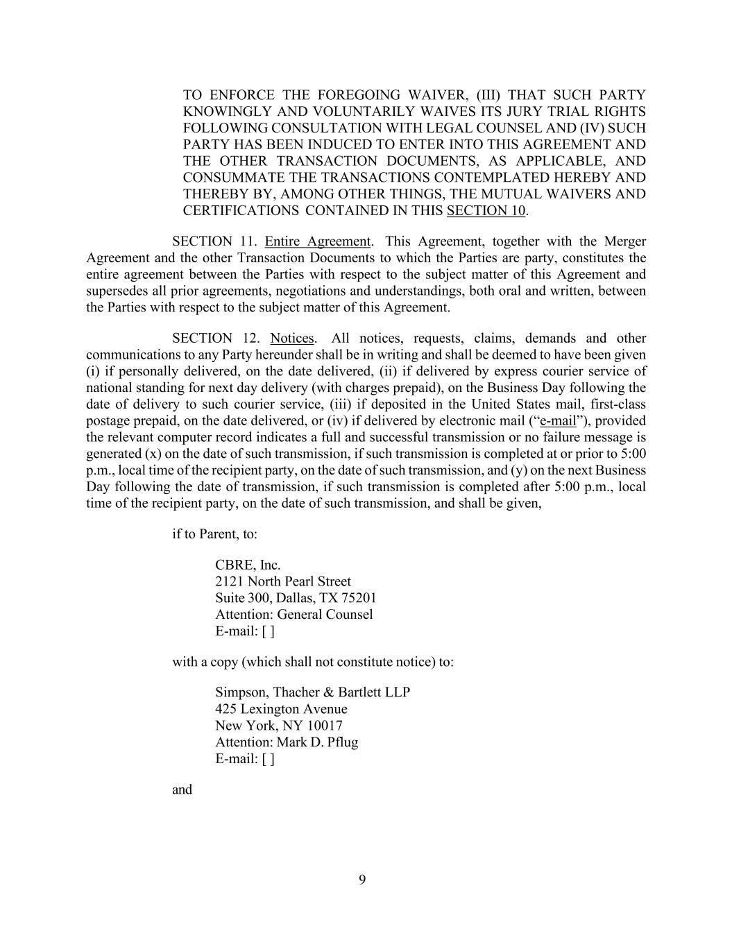 9 TO ENFORCE THE FOREGOING WAIVER, (III) THAT SUCH PARTY KNOWINGLY AND VOLUNTARILY WAIVES ITS JURY TRIAL RIGHTS FOLLOWING CONSULTATION WITH LEGAL COUNSEL AND (IV) SUCH PARTY HAS BEEN INDUCED TO ENTER INTO THIS AGREEMENT AND THE OTHER TRANSACTION DOCUMENTS, AS APPLICABLE, AND CONSUMMATE THE TRANSACTIONS CONTEMPLATED HEREBY AND THEREBY BY, AMONG OTHER THINGS, THE MUTUAL WAIVERS AND CERTIFICATIONS CONTAINED IN THIS SECTION 10. SECTION 11. Entire Agreement. This Agreement, together with the Merger Agreement and the other Transaction Documents to which the Parties are party, constitutes the entire agreement between the Parties with respect to the subject matter of this Agreement and supersedes all prior agreements, negotiations and understandings, both oral and written, between the Parties with respect to the subject matter of this Agreement. SECTION 12. Notices. All notices, requests, claims, demands and other communications to any Party hereunder shall be in writing and shall be deemed to have been given (i) if personally delivered, on the date delivered, (ii) if delivered by express courier service of national standing for next day delivery (with charges prepaid), on the Business Day following the date of delivery to such courier service, (iii) if deposited in the United States mail, first-class postage prepaid, on the date delivered, or (iv) if delivered by electronic mail (“e-mail”), provided the relevant computer record indicates a full and successful transmission or no failure message is generated (x) on the date of such transmission, if such transmission is completed at or prior to 5:00 p.m., local time of the recipient party, on the date of such transmission, and (y) on the next Business Day following the date of transmission, if such transmission is completed after 5:00 p.m., local time of the recipient party, on the date of such transmission, and shall be given, if to Parent, to: CBRE, Inc. 2121 North Pearl Street Suite 300, Dallas, TX 75201 Attention: General Counsel E-mail: [ ] with a copy (which shall not constitute notice) to: Simpson, Thacher & Bartlett LLP 425 Lexington Avenue New York, NY 10017 Attention: Mark D. Pflug E-mail: [ ] and