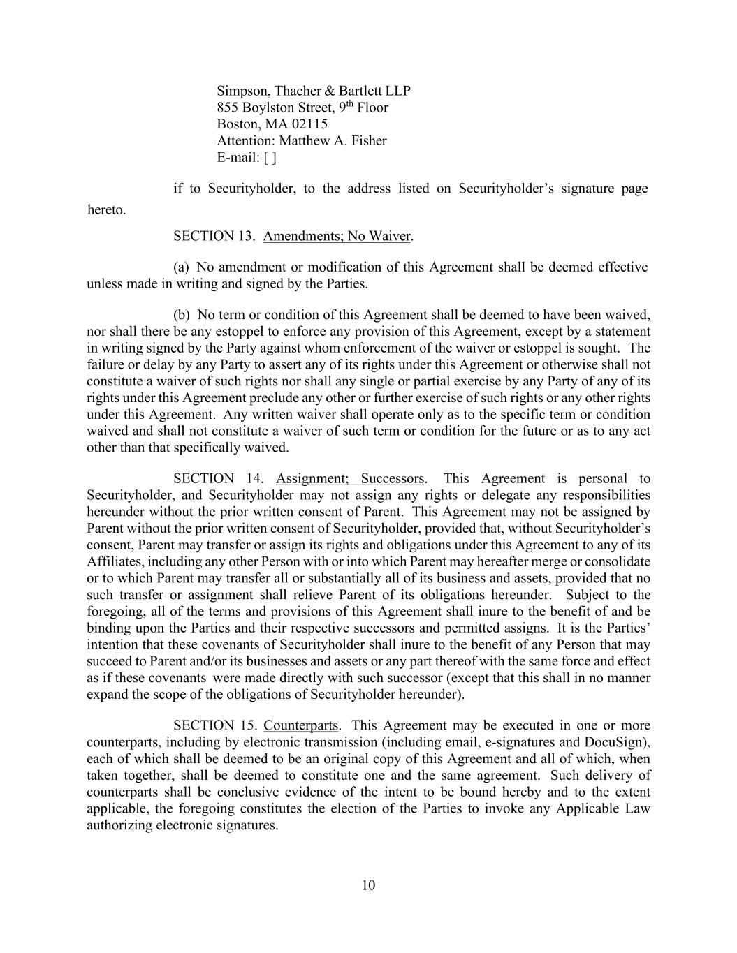 10 hereto. Simpson, Thacher & Bartlett LLP 855 Boylston Street, 9th Floor Boston, MA 02115 Attention: Matthew A. Fisher E-mail: [ ] if to Securityholder, to the address listed on Securityholder’s signature page SECTION 13. Amendments; No Waiver. (a) No amendment or modification of this Agreement shall be deemed effective unless made in writing and signed by the Parties. (b) No term or condition of this Agreement shall be deemed to have been waived, nor shall there be any estoppel to enforce any provision of this Agreement, except by a statement in writing signed by the Party against whom enforcement of the waiver or estoppel is sought. The failure or delay by any Party to assert any of its rights under this Agreement or otherwise shall not constitute a waiver of such rights nor shall any single or partial exercise by any Party of any of its rights under this Agreement preclude any other or further exercise of such rights or any other rights under this Agreement. Any written waiver shall operate only as to the specific term or condition waived and shall not constitute a waiver of such term or condition for the future or as to any act other than that specifically waived. SECTION 14. Assignment; Successors. This Agreement is personal to Securityholder, and Securityholder may not assign any rights or delegate any responsibilities hereunder without the prior written consent of Parent. This Agreement may not be assigned by Parent without the prior written consent of Securityholder, provided that, without Securityholder’s consent, Parent may transfer or assign its rights and obligations under this Agreement to any of its Affiliates, including any other Person with or into which Parent may hereafter merge or consolidate or to which Parent may transfer all or substantially all of its business and assets, provided that no such transfer or assignment shall relieve Parent of its obligations hereunder. Subject to the foregoing, all of the terms and provisions of this Agreement shall inure to the benefit of and be binding upon the Parties and their respective successors and permitted assigns. It is the Parties’ intention that these covenants of Securityholder shall inure to the benefit of any Person that may succeed to Parent and/or its businesses and assets or any part thereof with the same force and effect as if these covenants were made directly with such successor (except that this shall in no manner expand the scope of the obligations of Securityholder hereunder). SECTION 15. Counterparts. This Agreement may be executed in one or more counterparts, including by electronic transmission (including email, e-signatures and DocuSign), each of which shall be deemed to be an original copy of this Agreement and all of which, when taken together, shall be deemed to constitute one and the same agreement. Such delivery of counterparts shall be conclusive evidence of the intent to be bound hereby and to the extent applicable, the foregoing constitutes the election of the Parties to invoke any Applicable Law authorizing electronic signatures.