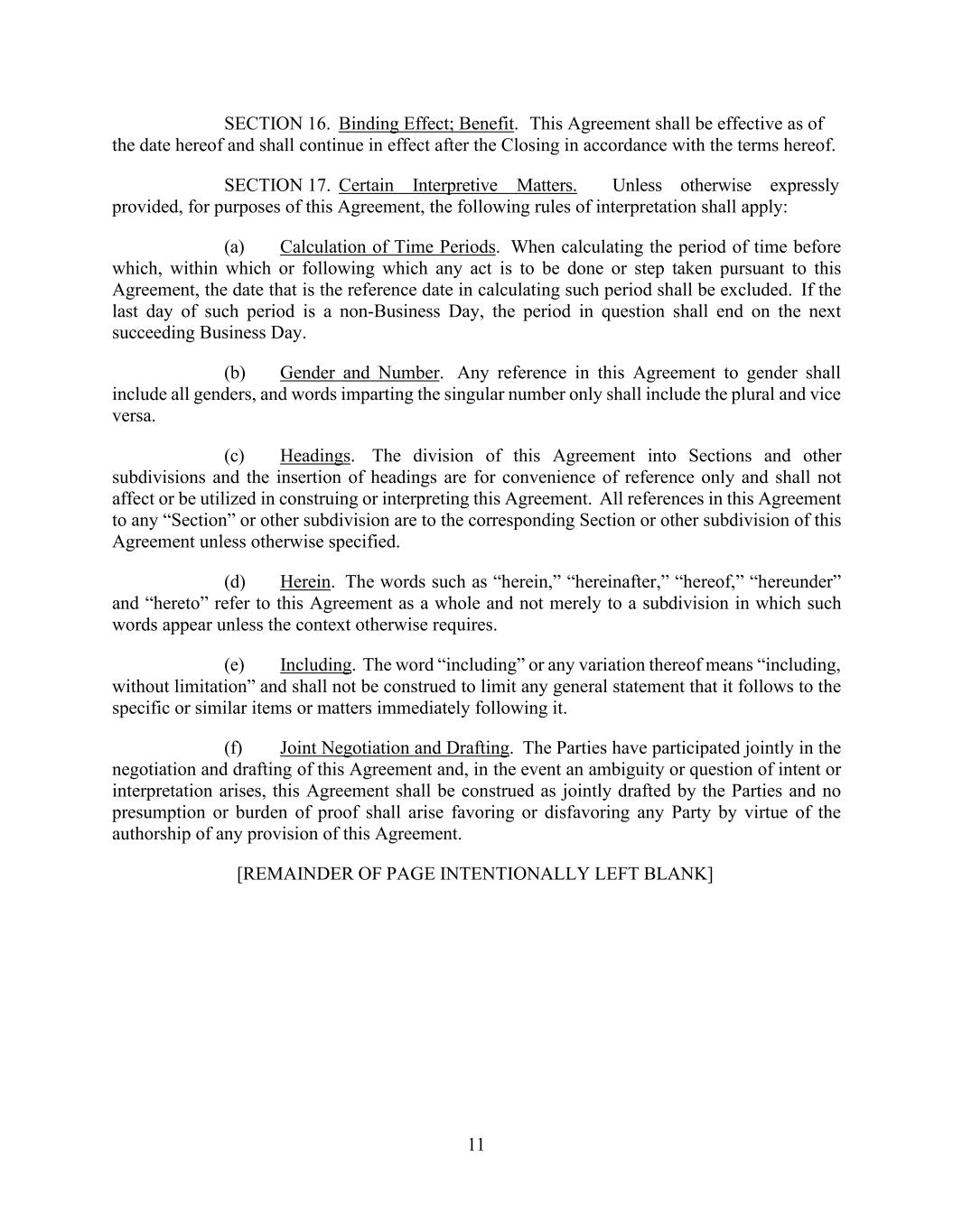 11 SECTION 16. Binding Effect; Benefit. This Agreement shall be effective as of the date hereof and shall continue in effect after the Closing in accordance with the terms hereof. SECTION 17. Certain Interpretive Matters. Unless otherwise expressly provided, for purposes of this Agreement, the following rules of interpretation shall apply: (a) Calculation of Time Periods. When calculating the period of time before which, within which or following which any act is to be done or step taken pursuant to this Agreement, the date that is the reference date in calculating such period shall be excluded. If the last day of such period is a non-Business Day, the period in question shall end on the next succeeding Business Day. (b) Gender and Number. Any reference in this Agreement to gender shall include all genders, and words imparting the singular number only shall include the plural and vice versa. (c) Headings. The division of this Agreement into Sections and other subdivisions and the insertion of headings are for convenience of reference only and shall not affect or be utilized in construing or interpreting this Agreement. All references in this Agreement to any “Section” or other subdivision are to the corresponding Section or other subdivision of this Agreement unless otherwise specified. (d) Herein. The words such as “herein,” “hereinafter,” “hereof,” “hereunder” and “hereto” refer to this Agreement as a whole and not merely to a subdivision in which such words appear unless the context otherwise requires. (e) Including. The word “including” or any variation thereof means “including, without limitation” and shall not be construed to limit any general statement that it follows to the specific or similar items or matters immediately following it. (f) Joint Negotiation and Drafting. The Parties have participated jointly in the negotiation and drafting of this Agreement and, in the event an ambiguity or question of intent or interpretation arises, this Agreement shall be construed as jointly drafted by the Parties and no presumption or burden of proof shall arise favoring or disfavoring any Party by virtue of the authorship of any provision of this Agreement. [REMAINDER OF PAGE INTENTIONALLY LEFT BLANK]