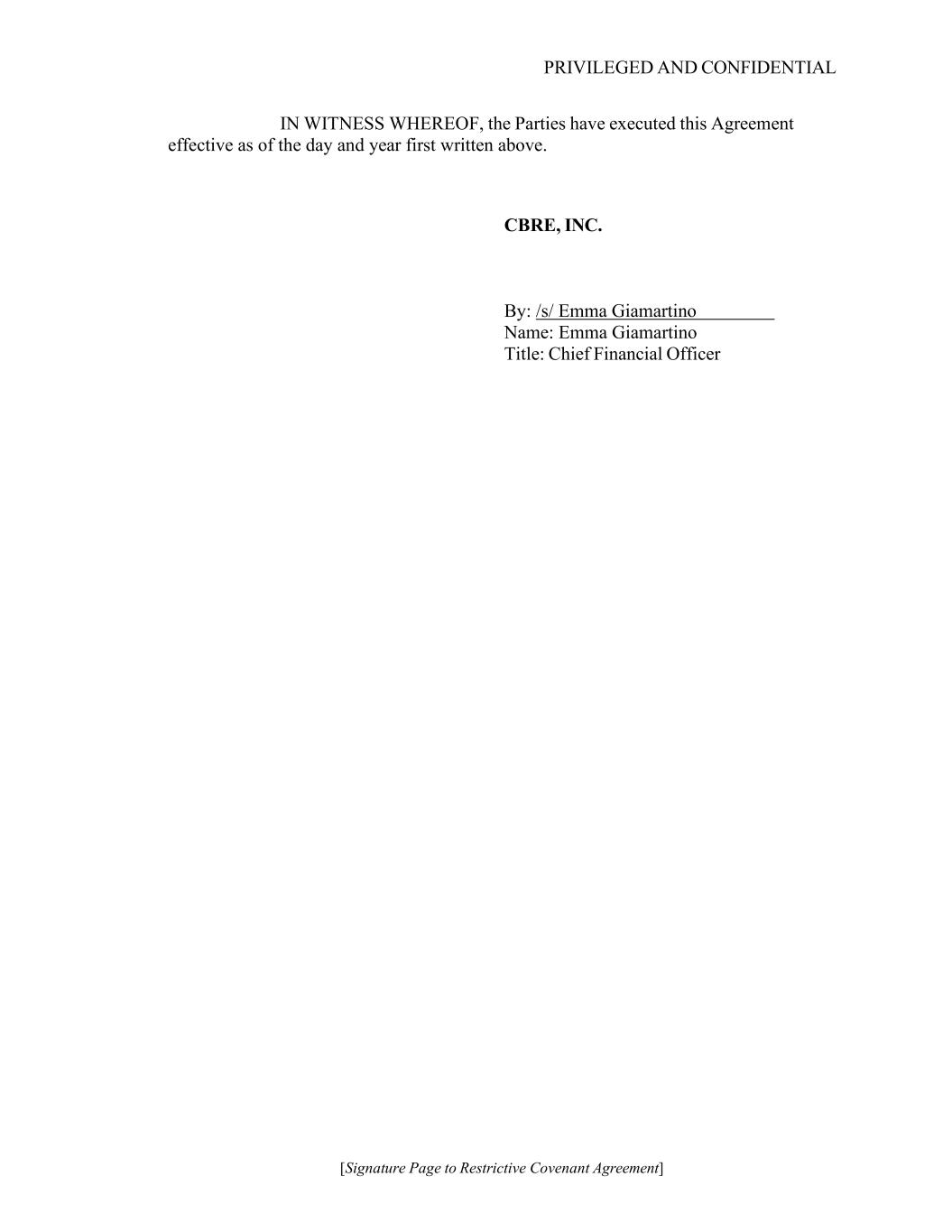 [Signature Page to Restrictive Covenant Agreement] PRIVILEGED AND CONFIDENTIAL IN WITNESS WHEREOF, the Parties have executed this Agreement effective as of the day and year first written above. CBRE, INC. By: /s/ Emma Giamartino Name: Emma Giamartino Title: Chief Financial Officer