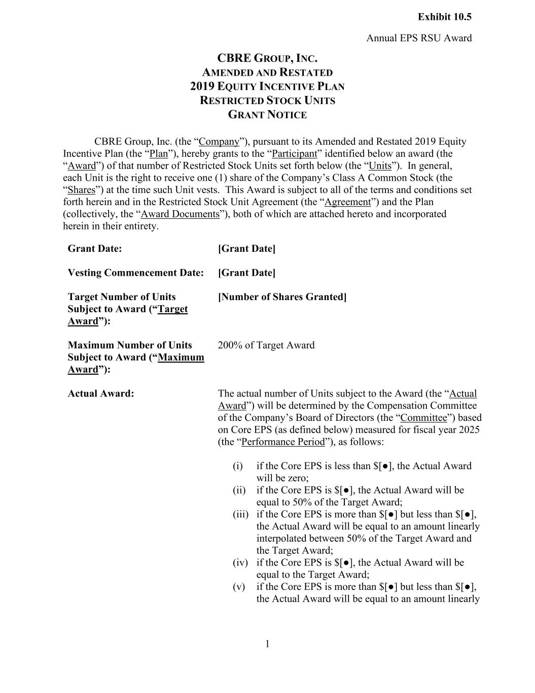 Annual EPS RSU Award 1 CBRE GROUP, INC. AMENDED AND RESTATED 2019 EQUITY INCENTIVE PLAN RESTRICTED STOCK UNITS GRANT NOTICE CBRE Group, Inc. (the “Company”), pursuant to its Amended and Restated 2019 Equity Incentive Plan (the “Plan”), hereby grants to the “Participant” identified below an award (the “Award”) of that number of Restricted Stock Units set forth below (the “Units”). In general, each Unit is the right to receive one (1) share of the Company’s Class A Common Stock (the “Shares”) at the time such Unit vests. This Award is subject to all of the terms and conditions set forth herein and in the Restricted Stock Unit Agreement (the “Agreement”) and the Plan (collectively, the “Award Documents”), both of which are attached hereto and incorporated herein in their entirety. Grant Date: [Grant Date] Vesting Commencement Date: [Grant Date] Target Number of Units Subject to Award (“Target Award”): [Number of Shares Granted] Maximum Number of Units Subject to Award (“Maximum Award”): 200% of Target Award Actual Award: The actual number of Units subject to the Award (the “Actual Award”) will be determined by the Compensation Committee of the Company’s Board of Directors (the “Committee”) based on Core EPS (as defined below) measured for fiscal year 2025 (the “Performance Period”), as follows: (i) if the Core EPS is less than $[●], the Actual Award will be zero; (ii) if the Core EPS is $[●], the Actual Award will be equal to 50% of the Target Award; (iii) if the Core EPS is more than $[●] but less than $[●], the Actual Award will be equal to an amount linearly interpolated between 50% of the Target Award and the Target Award; (iv) if the Core EPS is $[●], the Actual Award will be equal to the Target Award; (v) if the Core EPS is more than $[●] but less than $[●], the Actual Award will be equal to an amount linearly Exhibit 10.5