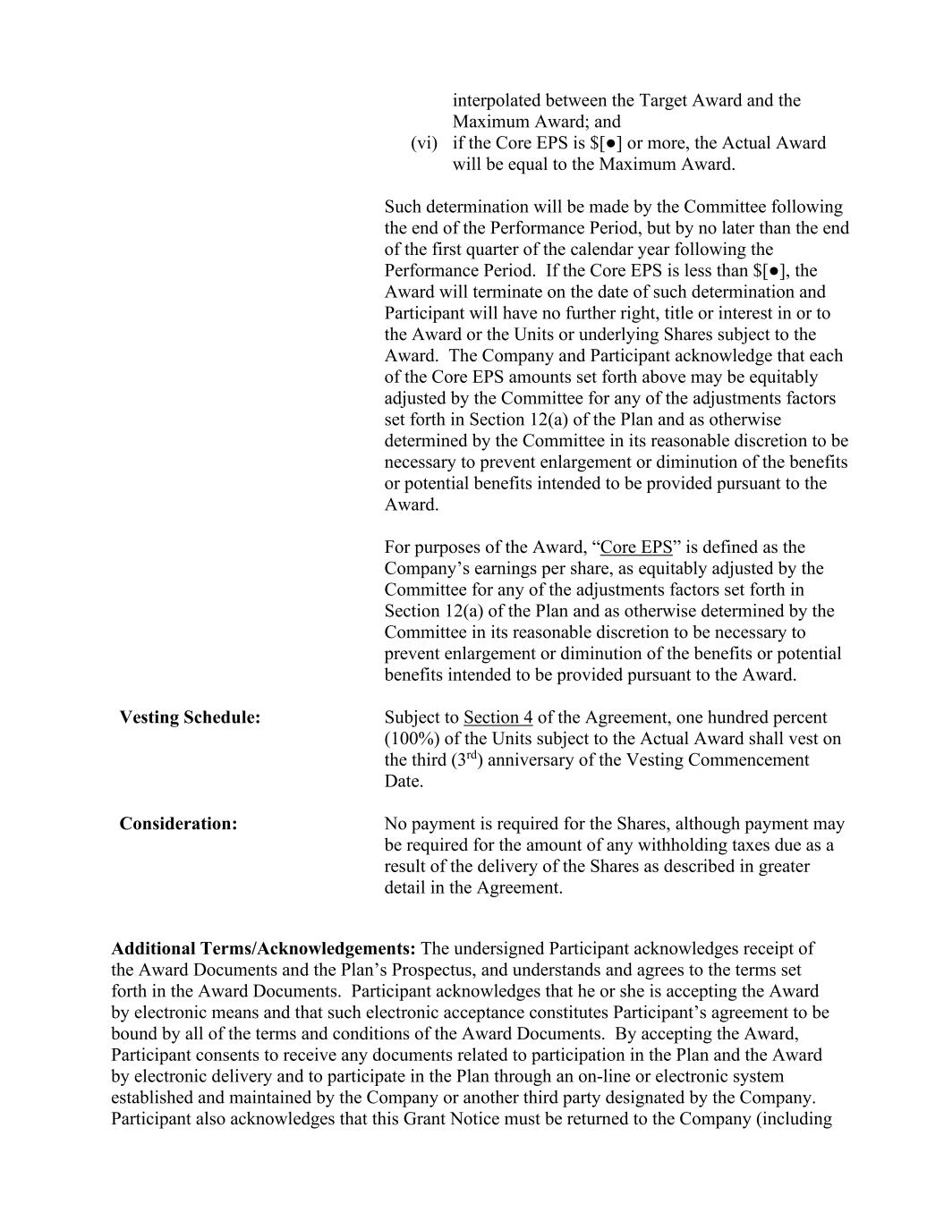interpolated between the Target Award and the Maximum Award; and (vi) if the Core EPS is $[●] or more, the Actual Award will be equal to the Maximum Award. Such determination will be made by the Committee following the end of the Performance Period, but by no later than the end of the first quarter of the calendar year following the Performance Period. If the Core EPS is less than $[●], the Award will terminate on the date of such determination and Participant will have no further right, title or interest in or to the Award or the Units or underlying Shares subject to the Award. The Company and Participant acknowledge that each of the Core EPS amounts set forth above may be equitably adjusted by the Committee for any of the adjustments factors set forth in Section 12(a) of the Plan and as otherwise determined by the Committee in its reasonable discretion to be necessary to prevent enlargement or diminution of the benefits or potential benefits intended to be provided pursuant to the Award. For purposes of the Award, “Core EPS” is defined as the Company’s earnings per share, as equitably adjusted by the Committee for any of the adjustments factors set forth in Section 12(a) of the Plan and as otherwise determined by the Committee in its reasonable discretion to be necessary to prevent enlargement or diminution of the benefits or potential benefits intended to be provided pursuant to the Award. Vesting Schedule: Subject to Section 4 of the Agreement, one hundred percent (100%) of the Units subject to the Actual Award shall vest on the third (3rd) anniversary of the Vesting Commencement Date. Consideration: No payment is required for the Shares, although payment may be required for the amount of any withholding taxes due as a result of the delivery of the Shares as described in greater detail in the Agreement. Additional Terms/Acknowledgements: The undersigned Participant acknowledges receipt of the Award Documents and the Plan’s Prospectus, and understands and agrees to the terms set forth in the Award Documents. Participant acknowledges that he or she is accepting the Award by electronic means and that such electronic acceptance constitutes Participant’s agreement to be bound by all of the terms and conditions of the Award Documents. By accepting the Award, Participant consents to receive any documents related to participation in the Plan and the Award by electronic delivery and to participate in the Plan through an on-line or electronic system established and maintained by the Company or another third party designated by the Company. Participant also acknowledges that this Grant Notice must be returned to the Company (including