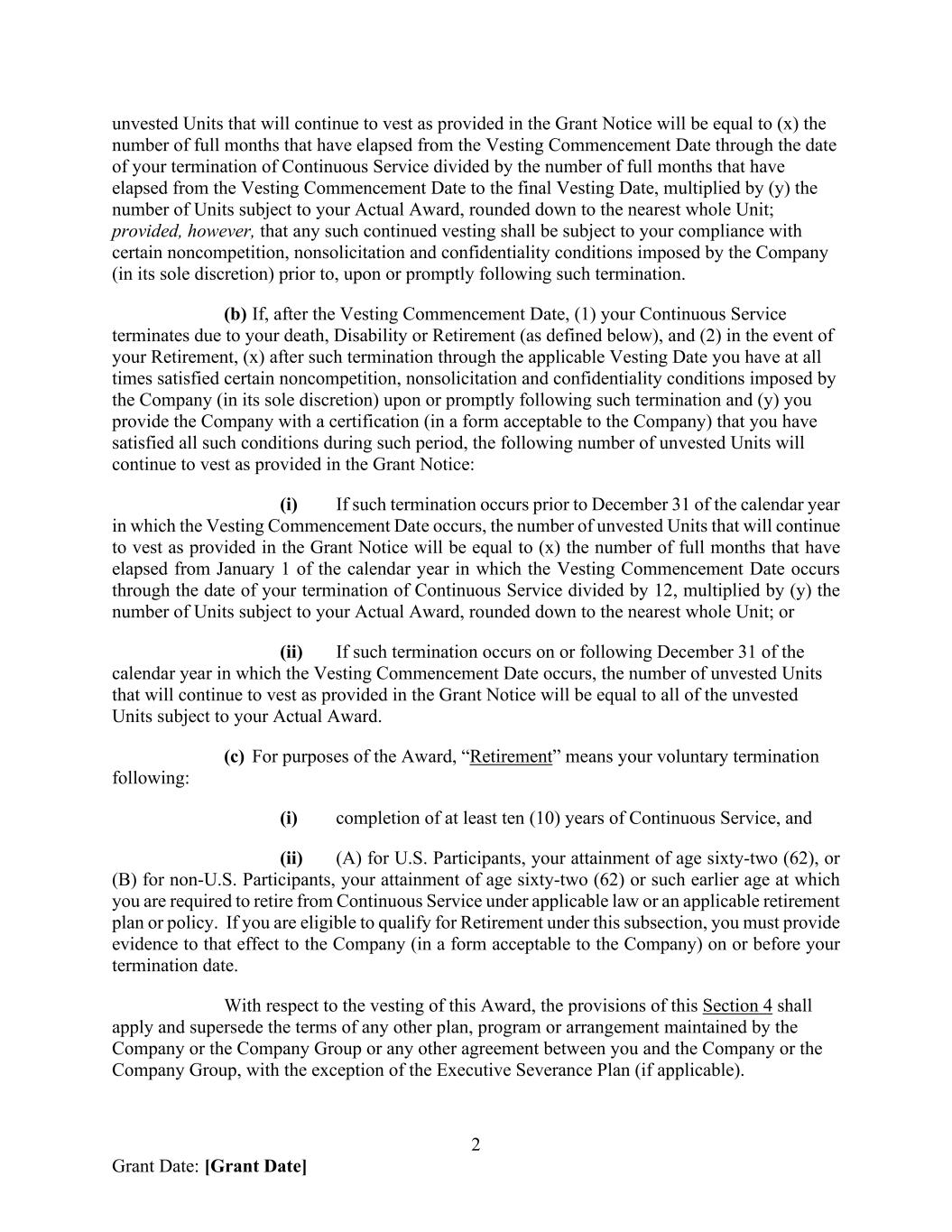2 Grant Date: [Grant Date] unvested Units that will continue to vest as provided in the Grant Notice will be equal to (x) the number of full months that have elapsed from the Vesting Commencement Date through the date of your termination of Continuous Service divided by the number of full months that have elapsed from the Vesting Commencement Date to the final Vesting Date, multiplied by (y) the number of Units subject to your Actual Award, rounded down to the nearest whole Unit; provided, however, that any such continued vesting shall be subject to your compliance with certain noncompetition, nonsolicitation and confidentiality conditions imposed by the Company (in its sole discretion) prior to, upon or promptly following such termination. (b) If, after the Vesting Commencement Date, (1) your Continuous Service terminates due to your death, Disability or Retirement (as defined below), and (2) in the event of your Retirement, (x) after such termination through the applicable Vesting Date you have at all times satisfied certain noncompetition, nonsolicitation and confidentiality conditions imposed by the Company (in its sole discretion) upon or promptly following such termination and (y) you provide the Company with a certification (in a form acceptable to the Company) that you have satisfied all such conditions during such period, the following number of unvested Units will continue to vest as provided in the Grant Notice: (i) If such termination occurs prior to December 31 of the calendar year in which the Vesting Commencement Date occurs, the number of unvested Units that will continue to vest as provided in the Grant Notice will be equal to (x) the number of full months that have elapsed from January 1 of the calendar year in which the Vesting Commencement Date occurs through the date of your termination of Continuous Service divided by 12, multiplied by (y) the number of Units subject to your Actual Award, rounded down to the nearest whole Unit; or (ii) If such termination occurs on or following December 31 of the calendar year in which the Vesting Commencement Date occurs, the number of unvested Units that will continue to vest as provided in the Grant Notice will be equal to all of the unvested Units subject to your Actual Award. (c) For purposes of the Award, “Retirement” means your voluntary termination following: (i) completion of at least ten (10) years of Continuous Service, and (ii) (A) for U.S. Participants, your attainment of age sixty-two (62), or (B) for non-U.S. Participants, your attainment of age sixty-two (62) or such earlier age at which you are required to retire from Continuous Service under applicable law or an applicable retirement plan or policy. If you are eligible to qualify for Retirement under this subsection, you must provide evidence to that effect to the Company (in a form acceptable to the Company) on or before your termination date. With respect to the vesting of this Award, the provisions of this Section 4 shall apply and supersede the terms of any other plan, program or arrangement maintained by the Company or the Company Group or any other agreement between you and the Company or the Company Group, with the exception of the Executive Severance Plan (if applicable).