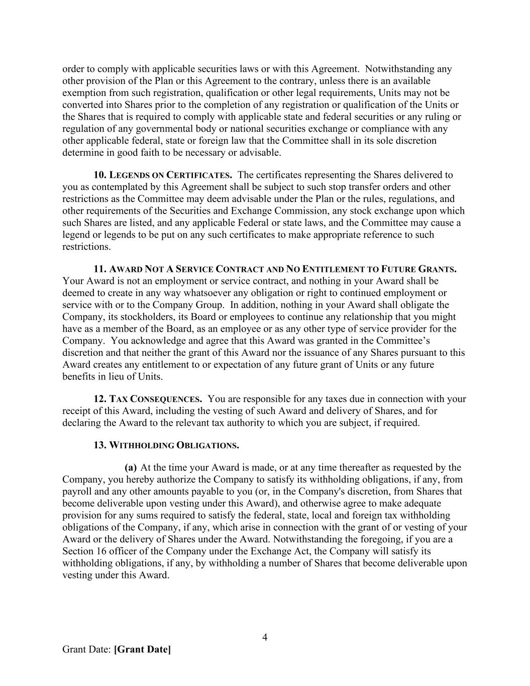 4 Grant Date: [Grant Date] order to comply with applicable securities laws or with this Agreement. Notwithstanding any other provision of the Plan or this Agreement to the contrary, unless there is an available exemption from such registration, qualification or other legal requirements, Units may not be converted into Shares prior to the completion of any registration or qualification of the Units or the Shares that is required to comply with applicable state and federal securities or any ruling or regulation of any governmental body or national securities exchange or compliance with any other applicable federal, state or foreign law that the Committee shall in its sole discretion determine in good faith to be necessary or advisable. 10. LEGENDS ON CERTIFICATES. The certificates representing the Shares delivered to you as contemplated by this Agreement shall be subject to such stop transfer orders and other restrictions as the Committee may deem advisable under the Plan or the rules, regulations, and other requirements of the Securities and Exchange Commission, any stock exchange upon which such Shares are listed, and any applicable Federal or state laws, and the Committee may cause a legend or legends to be put on any such certificates to make appropriate reference to such restrictions. 11. AWARD NOT A SERVICE CONTRACT AND NO ENTITLEMENT TO FUTURE GRANTS. Your Award is not an employment or service contract, and nothing in your Award shall be deemed to create in any way whatsoever any obligation or right to continued employment or service with or to the Company Group. In addition, nothing in your Award shall obligate the Company, its stockholders, its Board or employees to continue any relationship that you might have as a member of the Board, as an employee or as any other type of service provider for the Company. You acknowledge and agree that this Award was granted in the Committee’s discretion and that neither the grant of this Award nor the issuance of any Shares pursuant to this Award creates any entitlement to or expectation of any future grant of Units or any future benefits in lieu of Units. 12. TAX CONSEQUENCES. You are responsible for any taxes due in connection with your receipt of this Award, including the vesting of such Award and delivery of Shares, and for declaring the Award to the relevant tax authority to which you are subject, if required. 13. WITHHOLDING OBLIGATIONS. (a) At the time your Award is made, or at any time thereafter as requested by the Company, you hereby authorize the Company to satisfy its withholding obligations, if any, from payroll and any other amounts payable to you (or, in the Company's discretion, from Shares that become deliverable upon vesting under this Award), and otherwise agree to make adequate provision for any sums required to satisfy the federal, state, local and foreign tax withholding obligations of the Company, if any, which arise in connection with the grant of or vesting of your Award or the delivery of Shares under the Award. Notwithstanding the foregoing, if you are a Section 16 officer of the Company under the Exchange Act, the Company will satisfy its withholding obligations, if any, by withholding a number of Shares that become deliverable upon vesting under this Award.