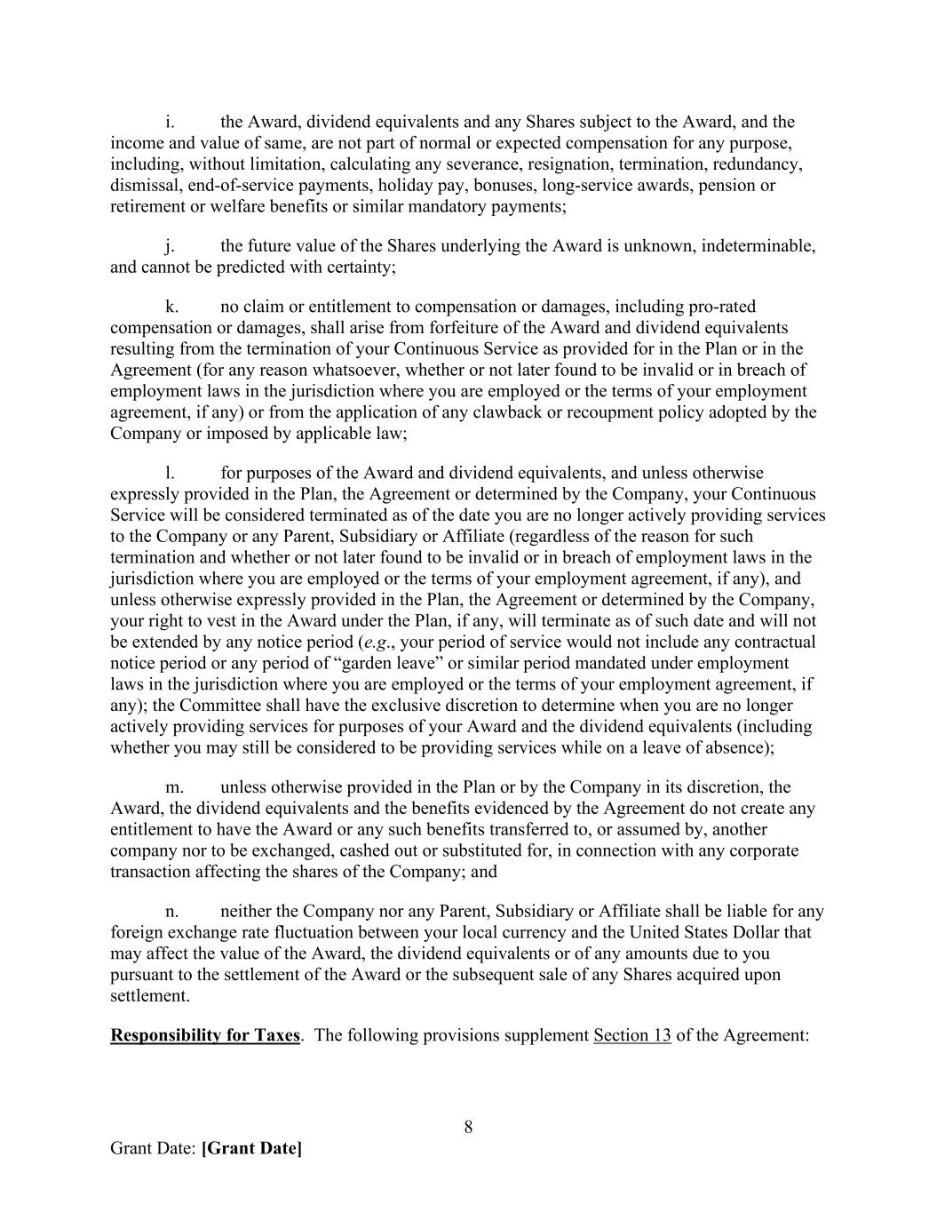 8 Grant Date: [Grant Date] i. the Award, dividend equivalents and any Shares subject to the Award, and the income and value of same, are not part of normal or expected compensation for any purpose, including, without limitation, calculating any severance, resignation, termination, redundancy, dismissal, end-of-service payments, holiday pay, bonuses, long-service awards, pension or retirement or welfare benefits or similar mandatory payments; j. the future value of the Shares underlying the Award is unknown, indeterminable, and cannot be predicted with certainty; k. no claim or entitlement to compensation or damages, including pro-rated compensation or damages, shall arise from forfeiture of the Award and dividend equivalents resulting from the termination of your Continuous Service as provided for in the Plan or in the Agreement (for any reason whatsoever, whether or not later found to be invalid or in breach of employment laws in the jurisdiction where you are employed or the terms of your employment agreement, if any) or from the application of any clawback or recoupment policy adopted by the Company or imposed by applicable law; l. for purposes of the Award and dividend equivalents, and unless otherwise expressly provided in the Plan, the Agreement or determined by the Company, your Continuous Service will be considered terminated as of the date you are no longer actively providing services to the Company or any Parent, Subsidiary or Affiliate (regardless of the reason for such termination and whether or not later found to be invalid or in breach of employment laws in the jurisdiction where you are employed or the terms of your employment agreement, if any), and unless otherwise expressly provided in the Plan, the Agreement or determined by the Company, your right to vest in the Award under the Plan, if any, will terminate as of such date and will not be extended by any notice period (e.g., your period of service would not include any contractual notice period or any period of “garden leave” or similar period mandated under employment laws in the jurisdiction where you are employed or the terms of your employment agreement, if any); the Committee shall have the exclusive discretion to determine when you are no longer actively providing services for purposes of your Award and the dividend equivalents (including whether you may still be considered to be providing services while on a leave of absence); m. unless otherwise provided in the Plan or by the Company in its discretion, the Award, the dividend equivalents and the benefits evidenced by the Agreement do not create any entitlement to have the Award or any such benefits transferred to, or assumed by, another company nor to be exchanged, cashed out or substituted for, in connection with any corporate transaction affecting the shares of the Company; and n. neither the Company nor any Parent, Subsidiary or Affiliate shall be liable for any foreign exchange rate fluctuation between your local currency and the United States Dollar that may affect the value of the Award, the dividend equivalents or of any amounts due to you pursuant to the settlement of the Award or the subsequent sale of any Shares acquired upon settlement. Responsibility for Taxes. The following provisions supplement Section 13 of the Agreement: