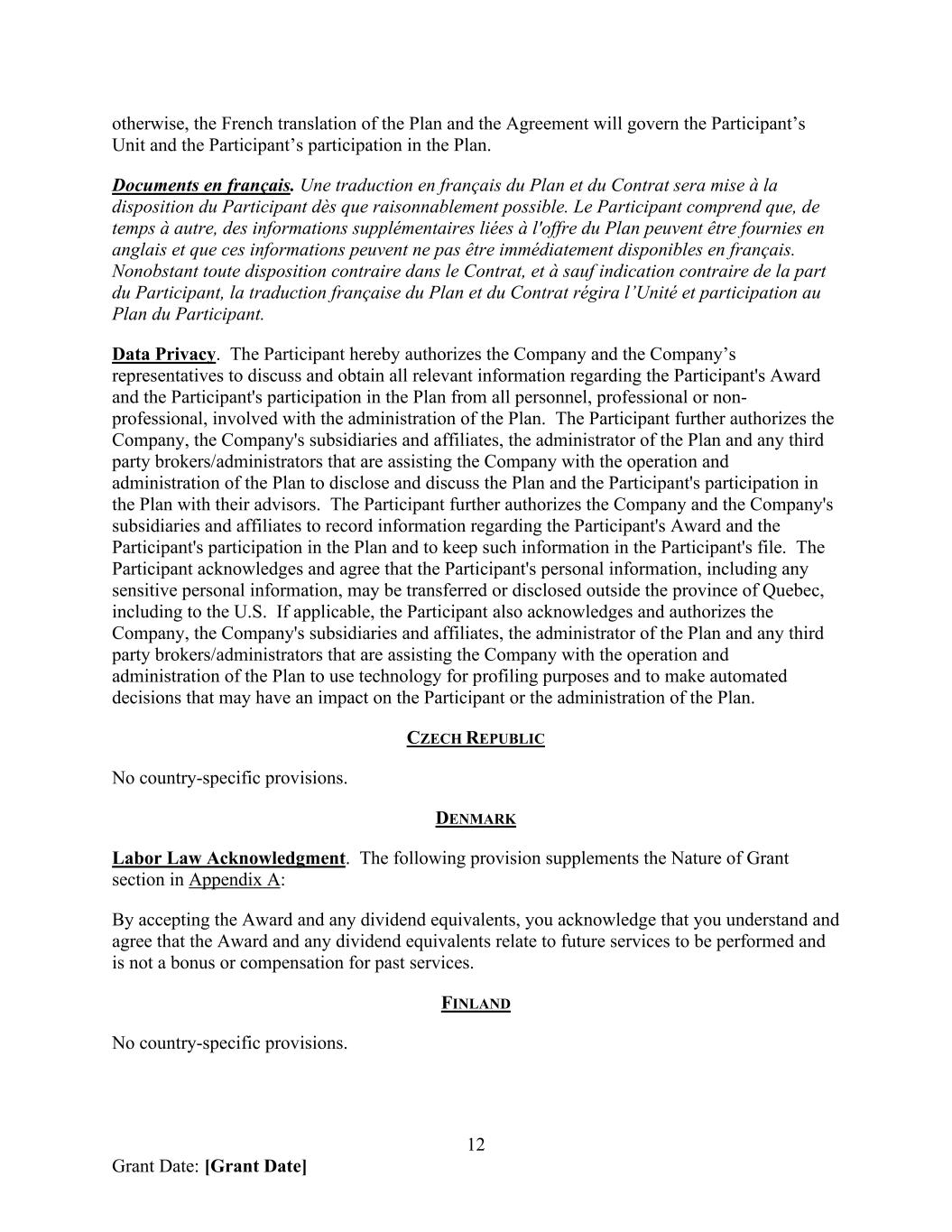 12 Grant Date: [Grant Date] otherwise, the French translation of the Plan and the Agreement will govern the Participant’s Unit and the Participant’s participation in the Plan. Documents en français. Une traduction en français du Plan et du Contrat sera mise à la disposition du Participant dès que raisonnablement possible. Le Participant comprend que, de temps à autre, des informations supplémentaires liées à l'offre du Plan peuvent être fournies en anglais et que ces informations peuvent ne pas être immédiatement disponibles en français. Nonobstant toute disposition contraire dans le Contrat, et à sauf indication contraire de la part du Participant, la traduction française du Plan et du Contrat régira l’Unité et participation au Plan du Participant. Data Privacy. The Participant hereby authorizes the Company and the Company’s representatives to discuss and obtain all relevant information regarding the Participant's Award and the Participant's participation in the Plan from all personnel, professional or non- professional, involved with the administration of the Plan. The Participant further authorizes the Company, the Company's subsidiaries and affiliates, the administrator of the Plan and any third party brokers/administrators that are assisting the Company with the operation and administration of the Plan to disclose and discuss the Plan and the Participant's participation in the Plan with their advisors. The Participant further authorizes the Company and the Company's subsidiaries and affiliates to record information regarding the Participant's Award and the Participant's participation in the Plan and to keep such information in the Participant's file. The Participant acknowledges and agree that the Participant's personal information, including any sensitive personal information, may be transferred or disclosed outside the province of Quebec, including to the U.S. If applicable, the Participant also acknowledges and authorizes the Company, the Company's subsidiaries and affiliates, the administrator of the Plan and any third party brokers/administrators that are assisting the Company with the operation and administration of the Plan to use technology for profiling purposes and to make automated decisions that may have an impact on the Participant or the administration of the Plan. CZECH REPUBLIC No country-specific provisions. DENMARK Labor Law Acknowledgment. The following provision supplements the Nature of Grant section in Appendix A: By accepting the Award and any dividend equivalents, you acknowledge that you understand and agree that the Award and any dividend equivalents relate to future services to be performed and is not a bonus or compensation for past services. FINLAND No country-specific provisions.