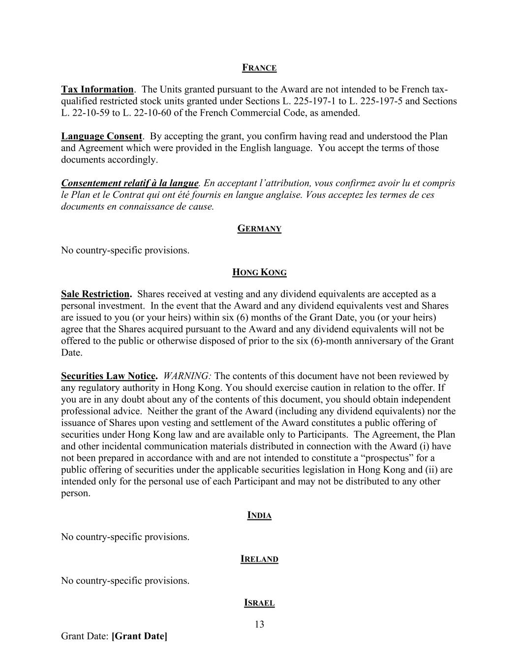 13 Grant Date: [Grant Date] FRANCE Tax Information. The Units granted pursuant to the Award are not intended to be French tax- qualified restricted stock units granted under Sections L. 225-197-1 to L. 225-197-5 and Sections L. 22-10-59 to L. 22-10-60 of the French Commercial Code, as amended. Language Consent. By accepting the grant, you confirm having read and understood the Plan and Agreement which were provided in the English language. You accept the terms of those documents accordingly. Consentement relatif à la langue. En acceptant l’attribution, vous confirmez avoir lu et compris le Plan et le Contrat qui ont été fournis en langue anglaise. Vous acceptez les termes de ces documents en connaissance de cause. GERMANY No country-specific provisions. HONG KONG Sale Restriction. Shares received at vesting and any dividend equivalents are accepted as a personal investment. In the event that the Award and any dividend equivalents vest and Shares are issued to you (or your heirs) within six (6) months of the Grant Date, you (or your heirs) agree that the Shares acquired pursuant to the Award and any dividend equivalents will not be offered to the public or otherwise disposed of prior to the six (6)-month anniversary of the Grant Date. Securities Law Notice. WARNING: The contents of this document have not been reviewed by any regulatory authority in Hong Kong. You should exercise caution in relation to the offer. If you are in any doubt about any of the contents of this document, you should obtain independent professional advice. Neither the grant of the Award (including any dividend equivalents) nor the issuance of Shares upon vesting and settlement of the Award constitutes a public offering of securities under Hong Kong law and are available only to Participants. The Agreement, the Plan and other incidental communication materials distributed in connection with the Award (i) have not been prepared in accordance with and are not intended to constitute a “prospectus” for a public offering of securities under the applicable securities legislation in Hong Kong and (ii) are intended only for the personal use of each Participant and may not be distributed to any other person. INDIA No country-specific provisions. IRELAND No country-specific provisions. ISRAEL