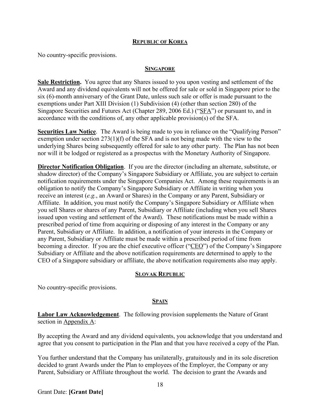 18 Grant Date: [Grant Date] REPUBLIC OF KOREA No country-specific provisions. SINGAPORE Sale Restriction. You agree that any Shares issued to you upon vesting and settlement of the Award and any dividend equivalents will not be offered for sale or sold in Singapore prior to the six (6)-month anniversary of the Grant Date, unless such sale or offer is made pursuant to the exemptions under Part XIII Division (1) Subdivision (4) (other than section 280) of the Singapore Securities and Futures Act (Chapter 289, 2006 Ed.) (“SFA”) or pursuant to, and in accordance with the conditions of, any other applicable provision(s) of the SFA. Securities Law Notice. The Award is being made to you in reliance on the “Qualifying Person” exemption under section 273(1)(f) of the SFA and is not being made with the view to the underlying Shares being subsequently offered for sale to any other party. The Plan has not been nor will it be lodged or registered as a prospectus with the Monetary Authority of Singapore. Director Notification Obligation. If you are the director (including an alternate, substitute, or shadow director) of the Company’s Singapore Subsidiary or Affiliate, you are subject to certain notification requirements under the Singapore Companies Act. Among these requirements is an obligation to notify the Company’s Singapore Subsidiary or Affiliate in writing when you receive an interest (e.g., an Award or Shares) in the Company or any Parent, Subsidiary or Affiliate. In addition, you must notify the Company’s Singapore Subsidiary or Affiliate when you sell Shares or shares of any Parent, Subsidiary or Affiliate (including when you sell Shares issued upon vesting and settlement of the Award). These notifications must be made within a prescribed period of time from acquiring or disposing of any interest in the Company or any Parent, Subsidiary or Affiliate. In addition, a notification of your interests in the Company or any Parent, Subsidiary or Affiliate must be made within a prescribed period of time from becoming a director. If you are the chief executive officer (“CEO”) of the Company’s Singapore Subsidiary or Affiliate and the above notification requirements are determined to apply to the CEO of a Singapore subsidiary or affiliate, the above notification requirements also may apply. SLOVAK REPUBLIC No country-specific provisions. SPAIN Labor Law Acknowledgement. The following provision supplements the Nature of Grant section in Appendix A: By accepting the Award and any dividend equivalents, you acknowledge that you understand and agree that you consent to participation in the Plan and that you have received a copy of the Plan. You further understand that the Company has unilaterally, gratuitously and in its sole discretion decided to grant Awards under the Plan to employees of the Employer, the Company or any Parent, Subsidiary or Affiliate throughout the world. The decision to grant the Awards and
