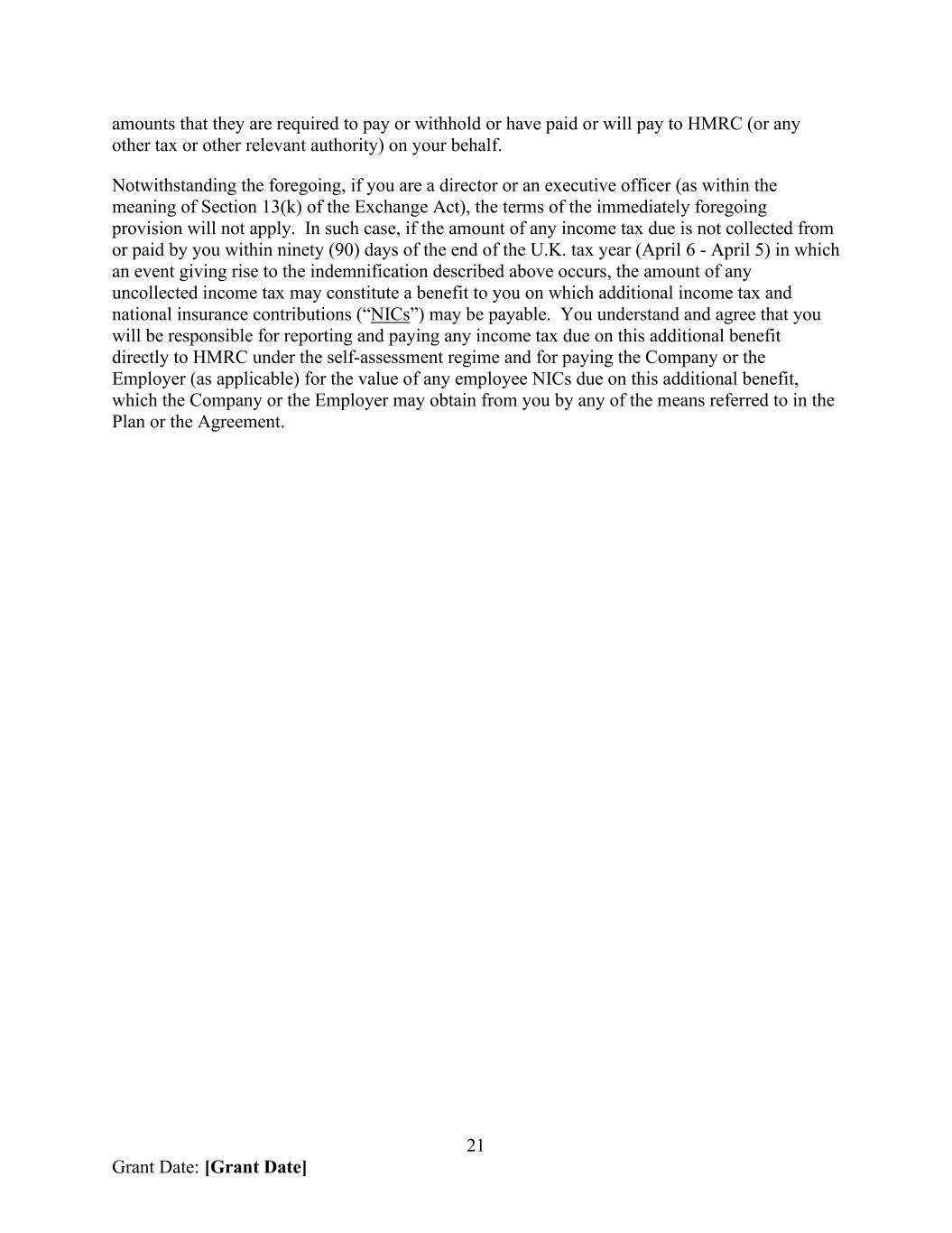 21 Grant Date: [Grant Date] amounts that they are required to pay or withhold or have paid or will pay to HMRC (or any other tax or other relevant authority) on your behalf. Notwithstanding the foregoing, if you are a director or an executive officer (as within the meaning of Section 13(k) of the Exchange Act), the terms of the immediately foregoing provision will not apply. In such case, if the amount of any income tax due is not collected from or paid by you within ninety (90) days of the end of the U.K. tax year (April 6 - April 5) in which an event giving rise to the indemnification described above occurs, the amount of any uncollected income tax may constitute a benefit to you on which additional income tax and national insurance contributions (“NICs”) may be payable. You understand and agree that you will be responsible for reporting and paying any income tax due on this additional benefit directly to HMRC under the self-assessment regime and for paying the Company or the Employer (as applicable) for the value of any employee NICs due on this additional benefit, which the Company or the Employer may obtain from you by any of the means referred to in the Plan or the Agreement.